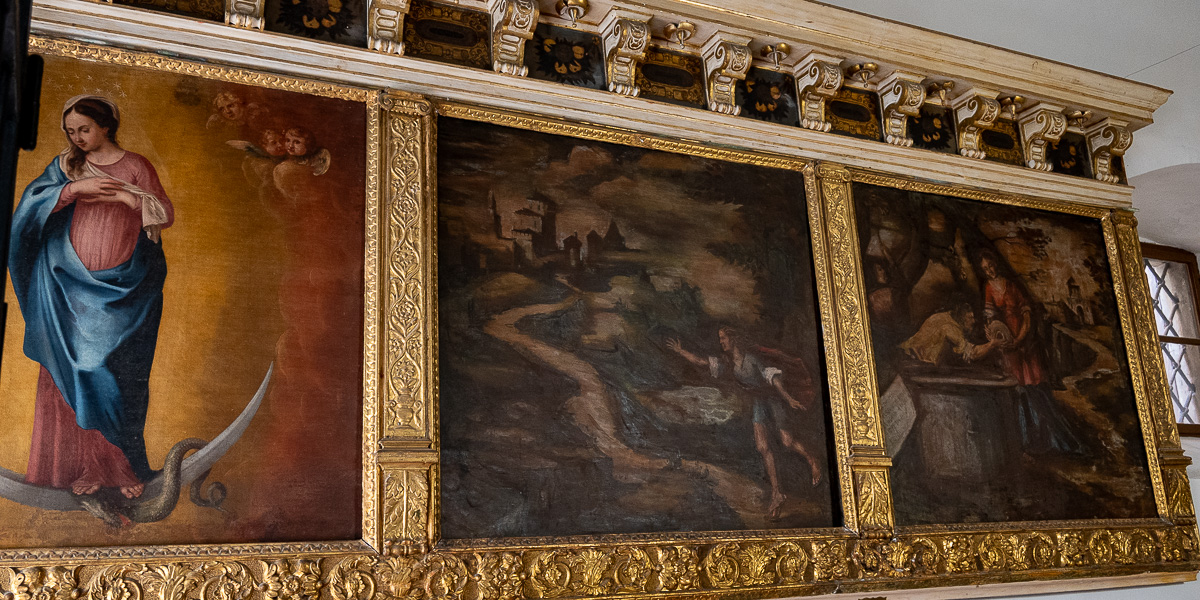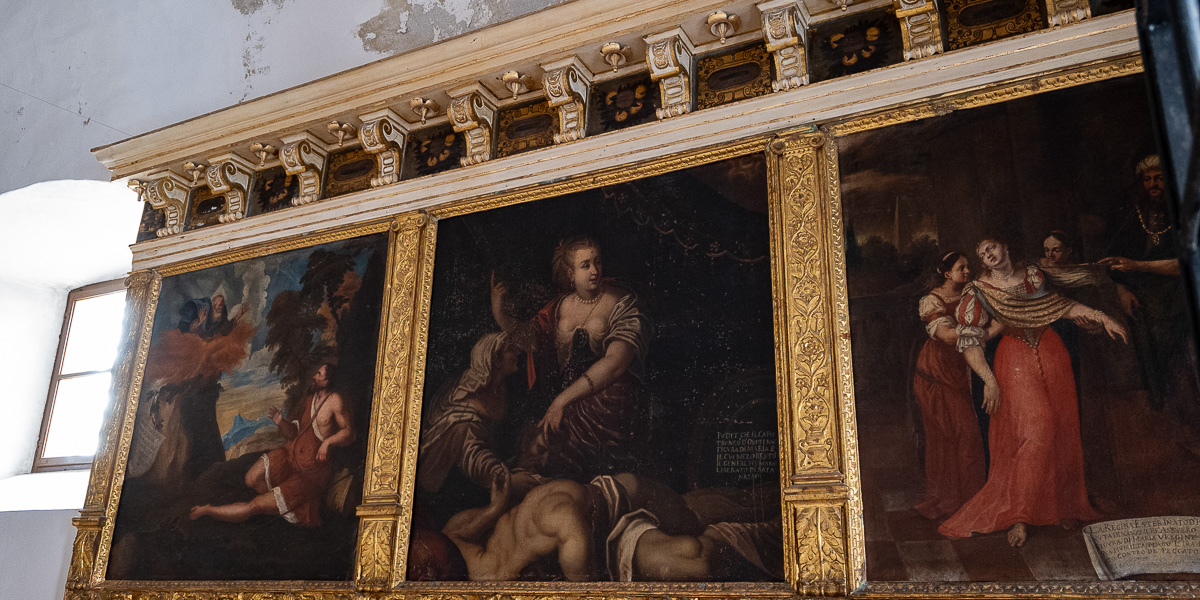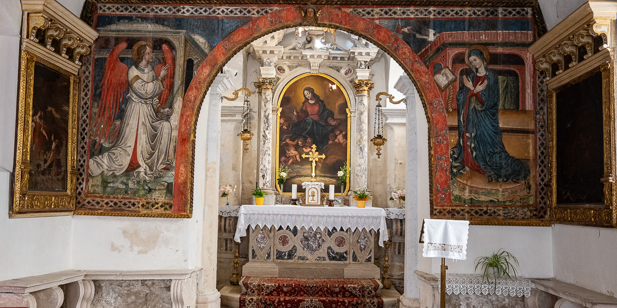 Tabelna slika Oznanjenje je delo beneškega slikarja iz let okoli 1430, Križanje, ki je nameščeno v zašiljenem gotskem oboku, pa je nastalo nekoliko kasneje, v letih 1450 - 1460. Mogoče ga je pripisati mojstru Nicolaju di Antoniu iz Pirana, ki ga omenjajo arhivski viri in je deloval v Padovi.