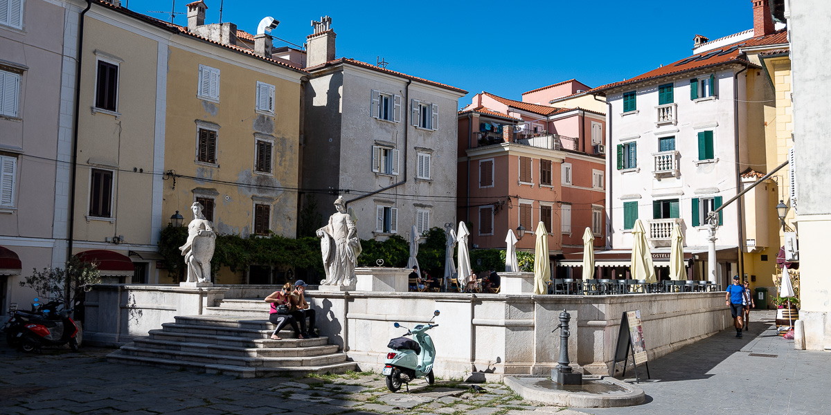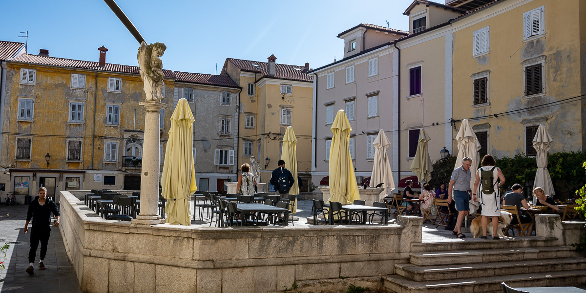 Na sredi trga stoji kamnit zbiralnik deževnice, ki zajema skoraj celotno površino trga. Zgradili so ga po hudi suši leta 1775. Na ploščad vodijo stopnice, ki jih krasita alegorična kipa Postave in Pravice. Na ščitu Postave je zapis podatkov o cisterni: letnica, opis namena gradnje in imena meščanov, ki so prispevali sredstva za gradnjo. Na ščitu Pravice so mestni grb, grb družine Marcello in grb rodbine Bemba.
